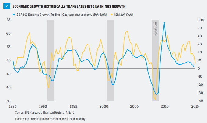 • Improving U.S. economic growth. We expect overall U.S. gross domestic product (GDP) growth of at least 2.5% this year on the back of larger contributions from manufacturing, business capital investment, and net exports, with continued support from consumer spending. Economic growth has historically translated into earnings growth-and recessions into earnings contractions-suggesting earnings may be poised for a rebound [Figure 2]. We expect a similar reversal in the Institute for Supply Management (ISM) Purchasing Managers’ Index (PMI), which has been depressed by the same factors as earnings and illustrates the tie between the U.S. economy and earnings.
