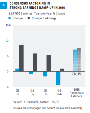 We believe consensus estimates, shown in Figure 4, may potentially be achievable for 2016 and note that the energy drag is already beginning to ease. Overall, we expect this pace of earnings growth in 2016, should it occur, to lead stocks to modest gains this year, though with elevated volatility.