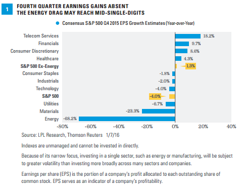 The start of fourth quarter earnings season may help the stock market find its footing. Earnings season starts this week (January 11-15) and may be a positive catalyst that turns the market’s attention away from China. Amid widespread pessimism, the news out of corporate America may be well received. However, due to the drags from oil and the strong U.S. dollar, the fourth quarter may bring more of the same lackluster headline results seen in recent quarters and, as a result, may not provide much of a boost for stocks.