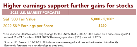 STOCKS. We expect solid economic and earnings growth in 2022 to help U.S. stocks deliver additional gains next year. If we are approaching—or are already in—the middle of an economic cycle with at least a few more years left (our view), then we believe the chances of another good year for stocks in 2022 are quite high. A double-digit percentage increase in S&P 500 earnings per share (EPS) in 2022 is possible, but COVID-19-related supply chain issues, combined with materials and labor shortages, could lead to higher costs and constrain profit margins. We believe the S&P 500 could be fairly valued at 5,000–5,100 at the end of 2022, based on an EPS estimate of $235 and an index P/E between 21 and 21.5. We favor U.S. over developed international, value over growth, and cyclical sectors over defensives.