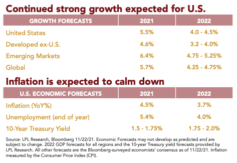 Our resurgent economy grew at over a 6% pace in the first half of the year and is on track for over 5% growth for the year when 2021 draws to a close. The current economic recovery, which started in May 2020, has benefited from widespread vaccine availability and additional fiscal stimulus. While the economy continues to move forward, we’re still feeling the aftershocks of the COVID-19 Delta variant, whether through elevated inflation, supply chain bottlenecks, or an imbalanced labor market. But 2021 also saw positives beyond economic growth, with schools opening their doors and extended family gathering around many Thanksgiving tables, activities that were far less common in 2020. At the same time, the S&P 500 Index continued to advance as corporate America faced this generational challenge with resiliency and saw earnings growth that surprised even the most optimistic pundits.