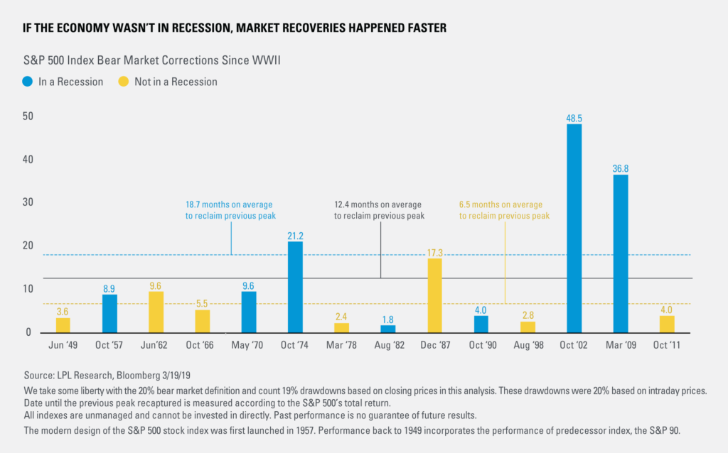 “Here’s the catch. The S&P 500 hasn’t made a new high since September 2018, but history tells us it does take about a year to recover after a bear market,” explained LPL Senior Market Strategist Ryan Detrick. “But the good news is, it took only about six months to recover when the economy wasn’t in a recession, making any new highs over the coming months perfectly normal.”