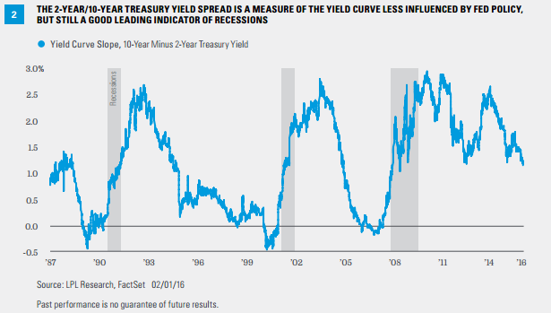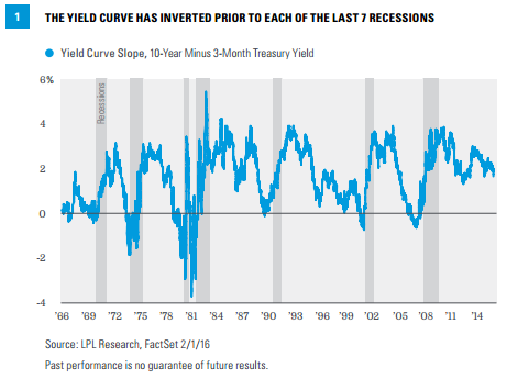 The yield curve has a perfect track record of forecasting recessions over the past 50 years. The yield curve has inverted (long-term yields are lower than short-term bond yields) between 5 and 16 months prior to each of the last 7 recessions, giving markets an early warning sign prior to the start of an economic downturn [Figure 1]. This is one reason why a measure of the yield curve is included in LPL Research’s Five Forecasters—a measure of five early warnings signals of a looming recession (see our recent Weekly Market Commentary, “Five Forecasters: Few Warning Signs”).