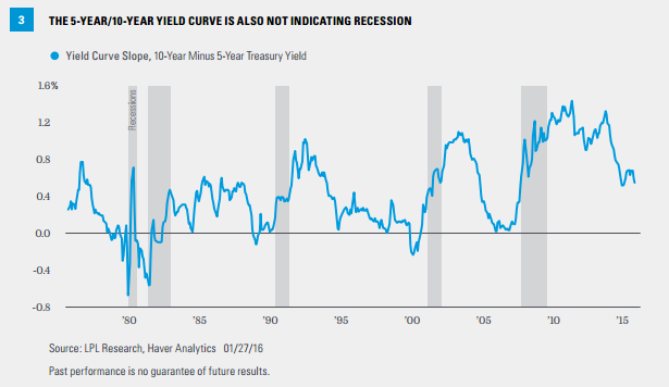 One of the least influenced measures of the yield curve is the yield differential between the 5- and 10-year Treasury yield [Figure 3]. The 5-year Treasury was not among short-term notes sold during the Fed’s Operation Twist and is less influenced by changes in the target fed funds rate (compared with the 3-month T-bill), while the 10-year Treasury was not targeted in the Fed’s most recent bond purchase program. A look at the yield curve as measured by 5- and 10-year Treasuries reveals a similar pattern and one that also is far from signaling a recession. In January 2016, the yield gap actually increased (not shown on chart), suggesting a modest improvement in growth expectations, but more likely simply a response to reduced market rate hike expectations and last week’s market-friendly Fed statement.